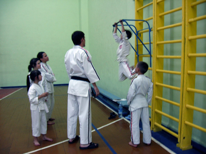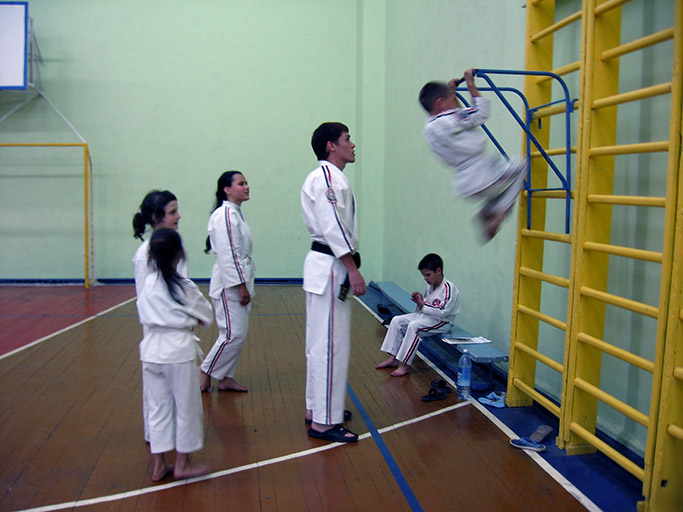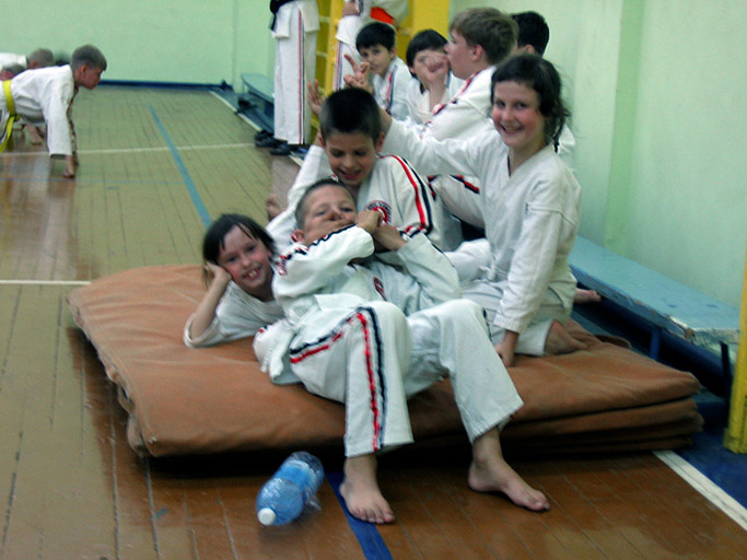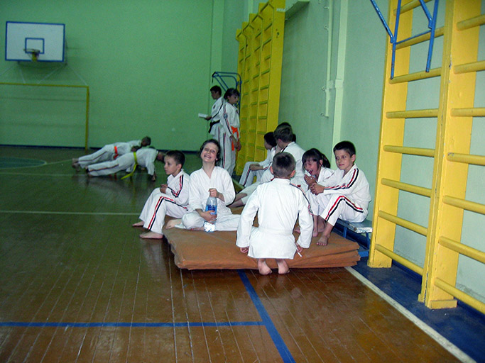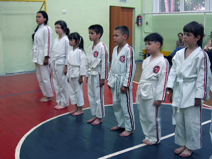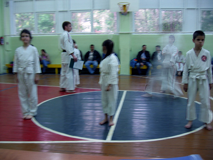 Очередные претенденты на желтые пояса: Титенина Екатерина, Тюгаева Элина, Ушаков Данила, Ромаданов Анатолий. Под взглядом «всевидящего ока» — все скромные и пушистые (хомячки-ангелы), стоит отвернуться — комок сумасшествия (ёжики-бесы). По итогом четверке присвоен 9-кю.