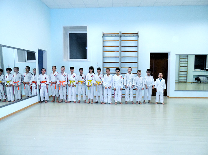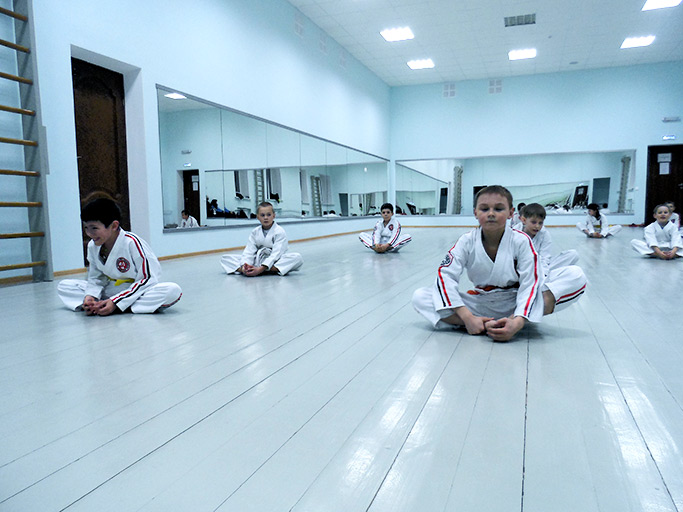 Тренировочное помещение во дворце (после ремонта). Как правило, если видят фотоаппарат в руках, то это всегда «вселяет восторг и снижает дисциплину», но, то ли цветовая палитра вмешалась в отточенный процесс кривлянья, то ли краска выветрилась не в конец, но факт — все за исключением честно провели большую часть тренировки в духе «образцовой сдержанности и средоточия», почти. Похлопаем же танцу «хлопающей обезьянки».