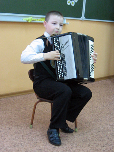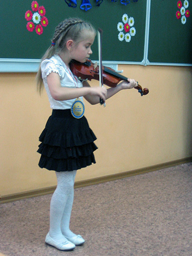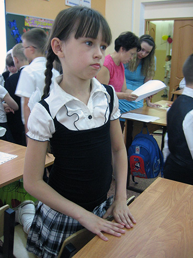 Для некоторых, «классный час» стал также и часом «звездным»: баллада на баяне, скрипичное соло, хоровое пение. Каждому вручили «за заслугу», а Линке «за трудолюбие» (лепить из пластилина она любит). В качестве бонуса — сладкий презент, на месте и с ходу.