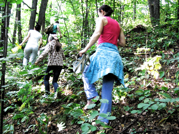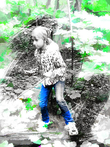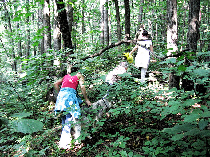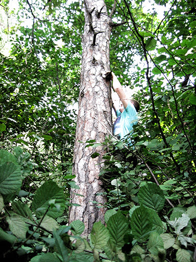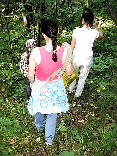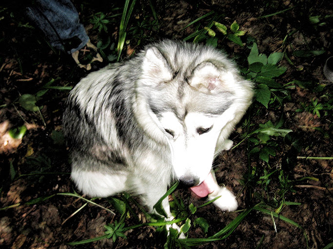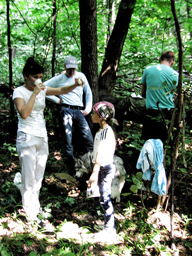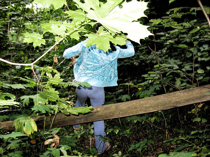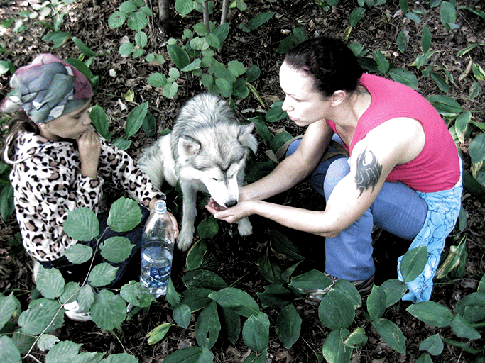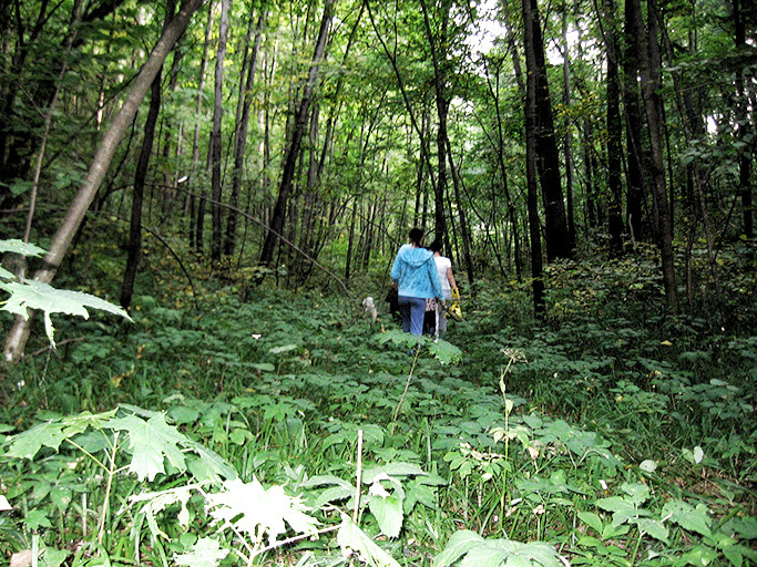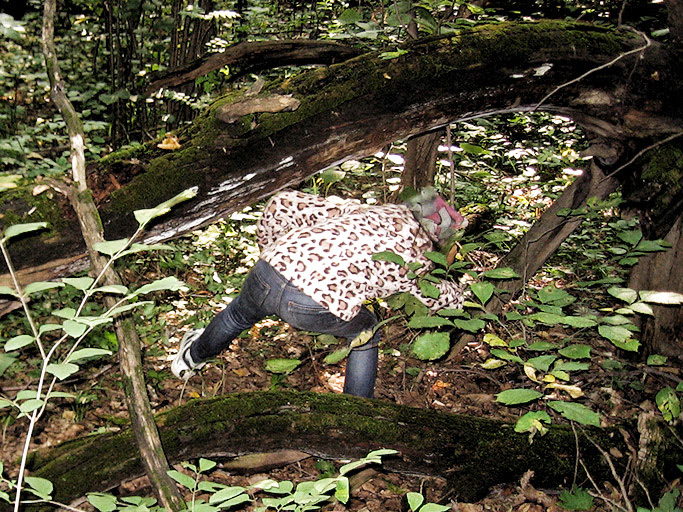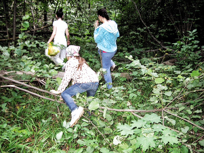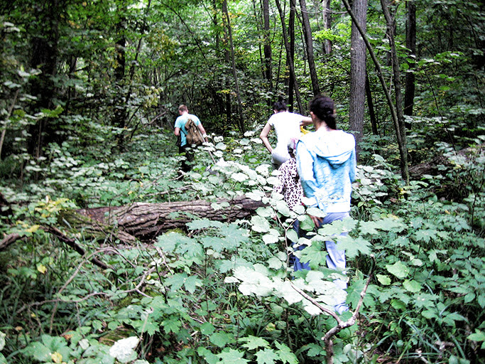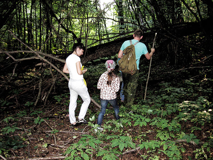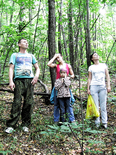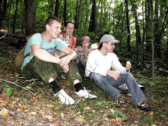 Цель прогулки у каждого оказалась своя: Машка грезила грибной поляной (даже одного не нашла), Артем искал известное ему одному мистическое место (нашел, но в отдалении), я Пумку выгуливала (нагуляла много клещей!), Серега тоже по началу просто гулял, но повстречав яблоню-мечты (много спелых яблок в пределах вытянутой руки) — надрал от души, а Линочка пиццу поесть на свежем (съела три). До второго привала все казалось отлично: Пумка набегалась (и уже не исчезала в глубине долго), ребята расширяли сознание, Линочка дрессировала; после третьего: Марина, потеряв надежду «хотя бы на гриб», жалуется на отсутствие цивилизации, Лина поддерживает. Все это в сумме привело к массовой истерике: «АРТЕМ, ТЫ КУДА НАС ЗАВЕЛ??!» Артем подключает троллинг: думаю, кабаны уже напали на наш след..., это только вопрос времени; следом я: Вова бы уже выстроил к этому моменту целую теория «как обмануть кабана и-и... — выжить!» («МА-МА!»), на четвертом привале решали: домой/в лес. Линочка решала. На палочках. Боялась: она решает, она в ответе. 50/50, длинная — домой, короткая — в лес; в итоге — одна из альтернатив, определенно, сначала обрадовалась, а потом уже домой-домой, а та, другая, еще чуть-чуть по лесу погуляла.