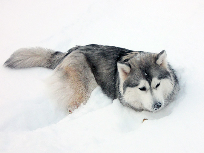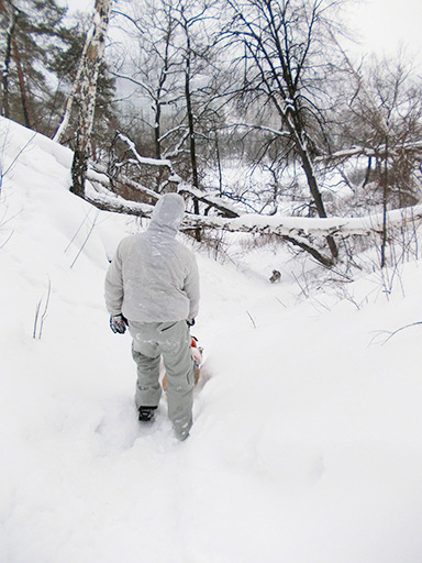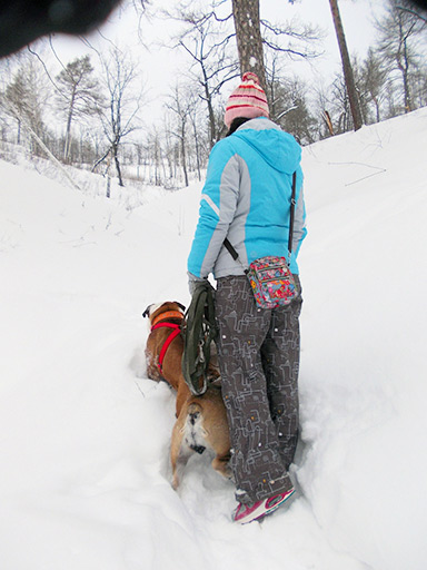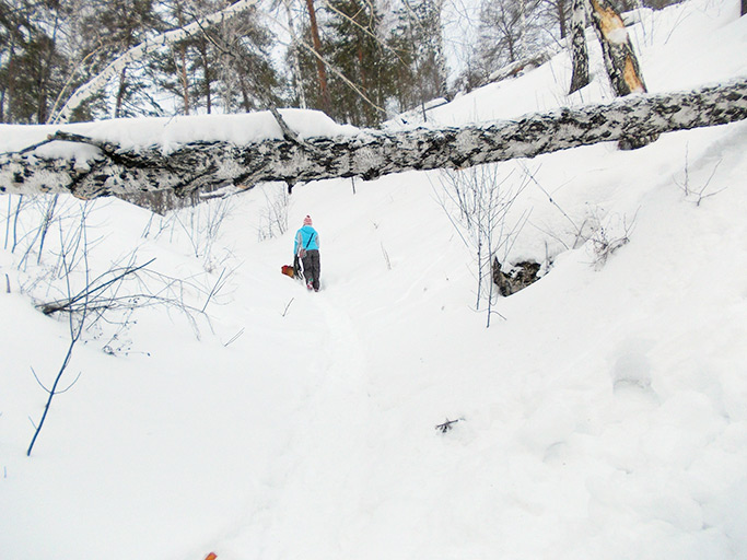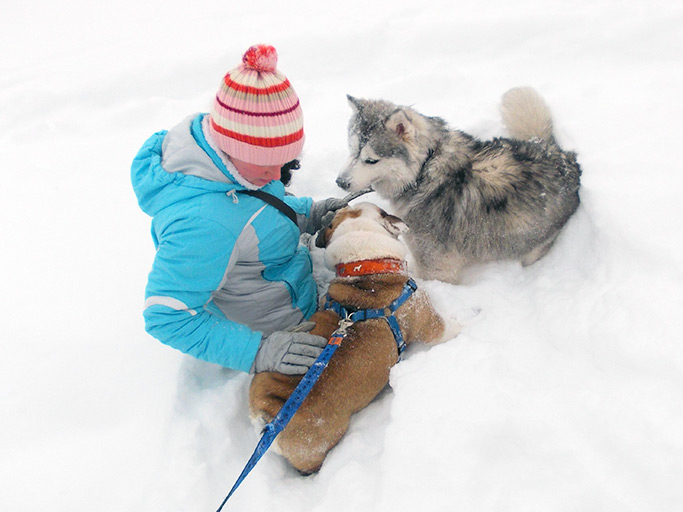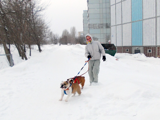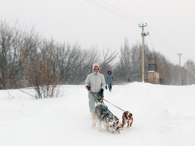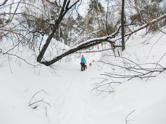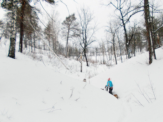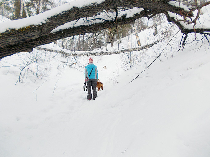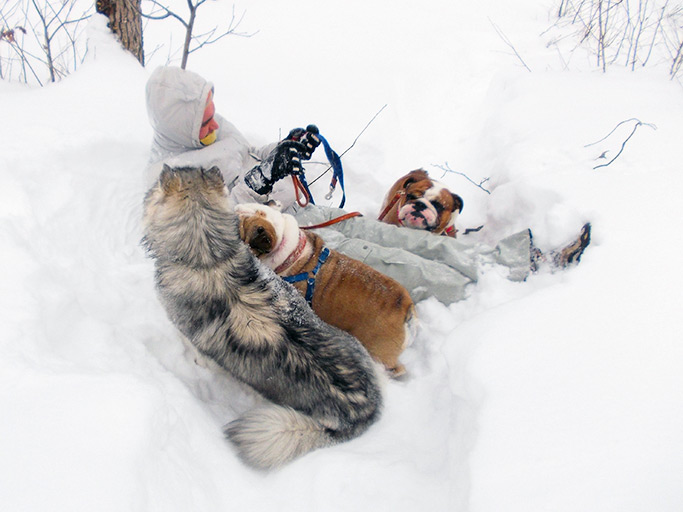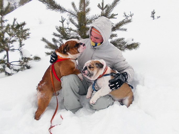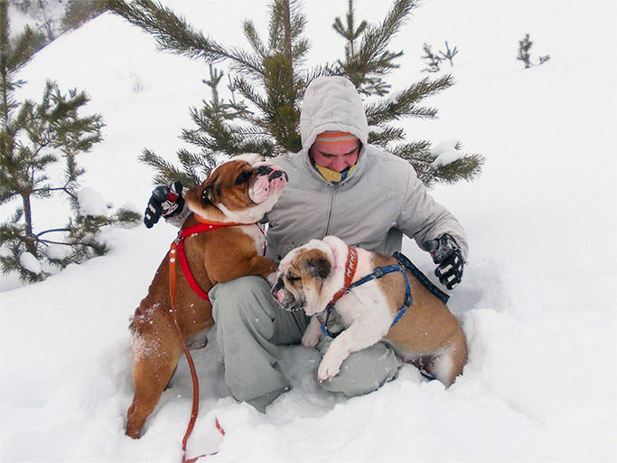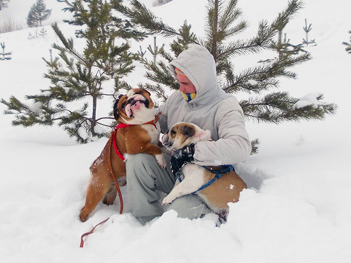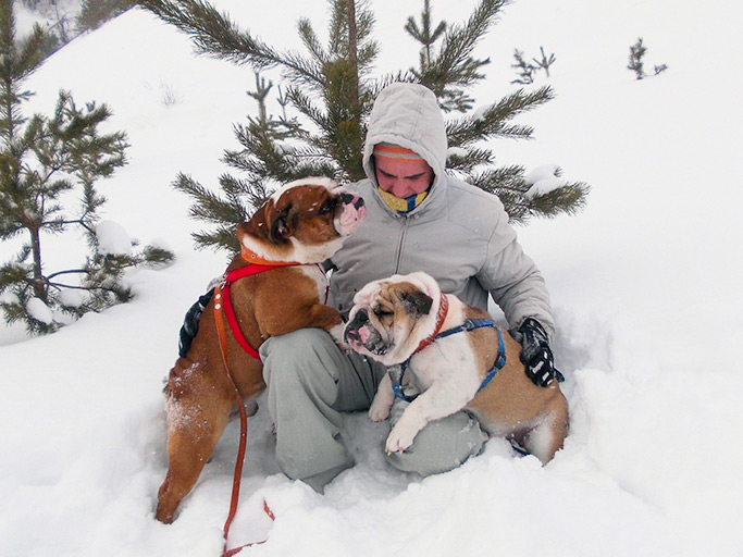 Решили проверить: куда все-таки уводит «кроличья нора». Вверх, выше, а вот и финиш, тропинка прервалась внезапно. Серега упал релаксировать в снег, но бульдоги, раздосадованные тем, что у них нет теплой одежды — чтобы также, вальяжно, на снегу, — стали требовать внимания. Эту миссию взяла на себя Пума. А теперь вниз, ниже, еще чуть поборолись в снегу, помурлыкали у елочек, и на тройке помчали к дому.