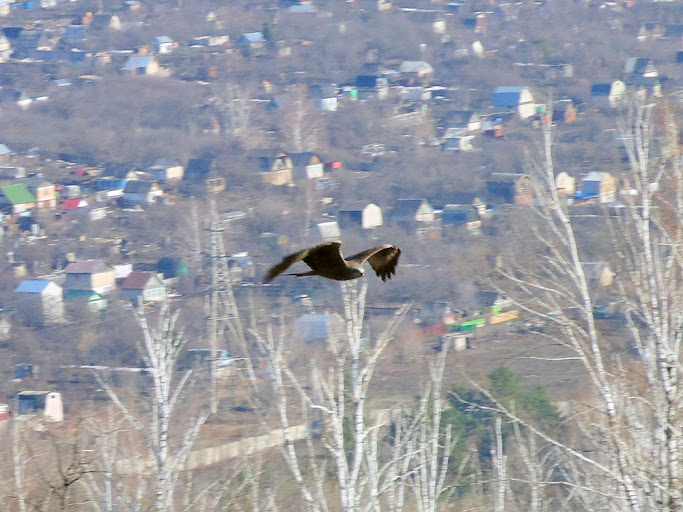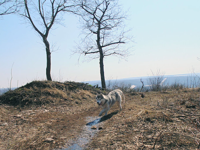 На южном склоне, снег уже почти растаял, но траве — рано, а для первых весенних цветов, традиционно — самое время. Черчиллю тяжело дался подъем, а вот Джеромке с Пумкой нравится, они нашли снег, и им — хо-ро-шо. Но и Черчилль, не упустил возможность охладиться, даже попросил «накидать сверху»... Сделано! На обратном пути, поляну затянуло дымкой, кто-то намеренно, или по неосторожности, запалил сухую траву, Пума наблюдала.