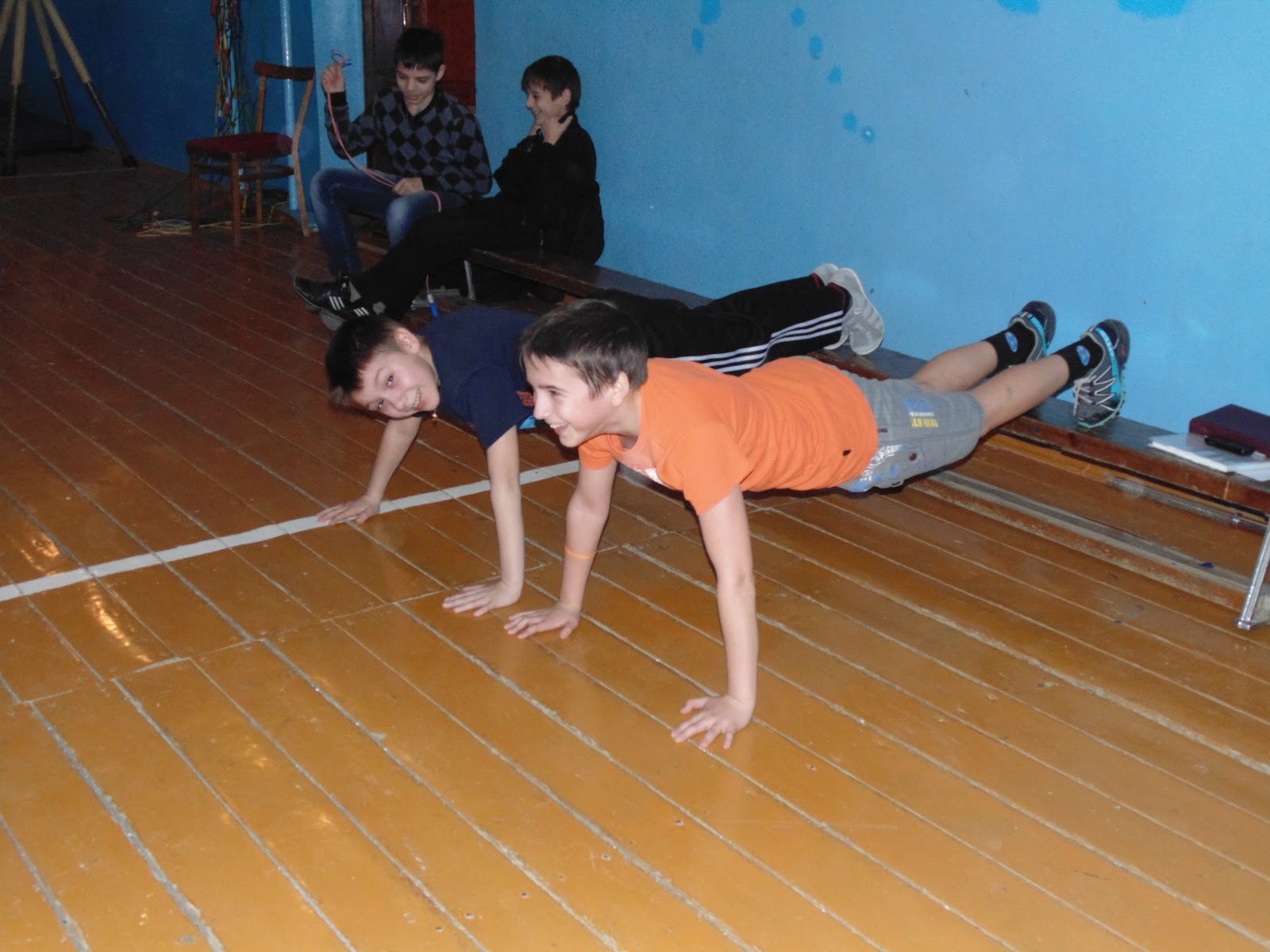 Постновогодние будни. Младшие классы играют в «горячую картошку» и соревнуются, «кто больше поймает капель», с потолка. «Средним» не до игр, урок ОФП: осваивают упражнения из гиревого спорта, качают пресс, подтягиваются, отжимаются.